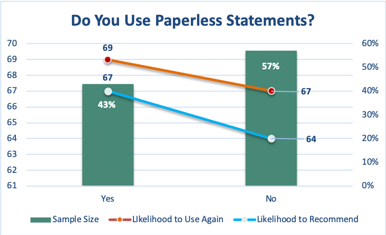 Surprisingly, 57 percent of borrowers nationally are still receiving paper mail statements. This is even though paperless statements are widely known to save lenders thousands, if not tens of thousands, of dollars annually. According to STRATMOR data, as seen in the graph below, paper statements are also costing lenders repeat and referral customers. Lenders who can track these types of metrics in their loan portfolios can print out a list of customers who receive paper statements and offer to walk them through the paperless set up process. In fact, tools like STRATMOR’s MortgageSAT Servicing Satisfaction Program can identify borrowers’ reasons for holding off from the switch to paperless. Lenders are often surprised to find hundreds of borrowers who say they would switch if they just knew how!