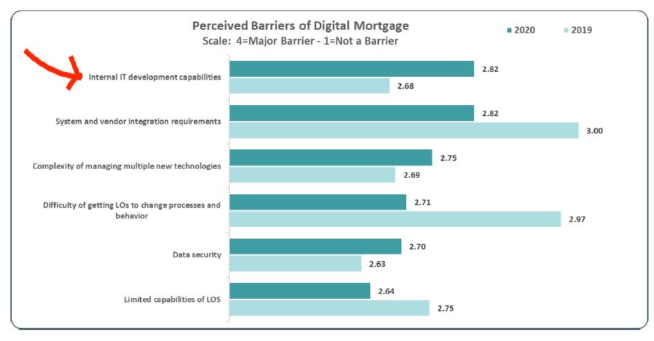 We asked lenders to rate the barriers they perceived standing between them and the digital mortgage on a scale of 1 (not a barrier) to 4 (major barrier). Internal development capabilities ranked seventh among all barriers that lenders faced in 2019. By 2020, it had moved to number one. It edged out system and vendor integration, last year’s most significant barrier, to take the top spot.