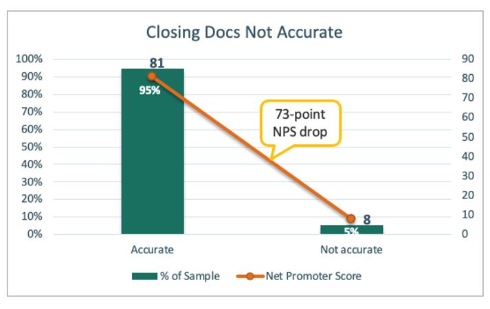 When a borrower sees an error on their closing documents, oftentimes a clerical error like a misspelled name or street address, it erodes their confidence that the remainder of the closing package is accurate and NPS falls 73 points.