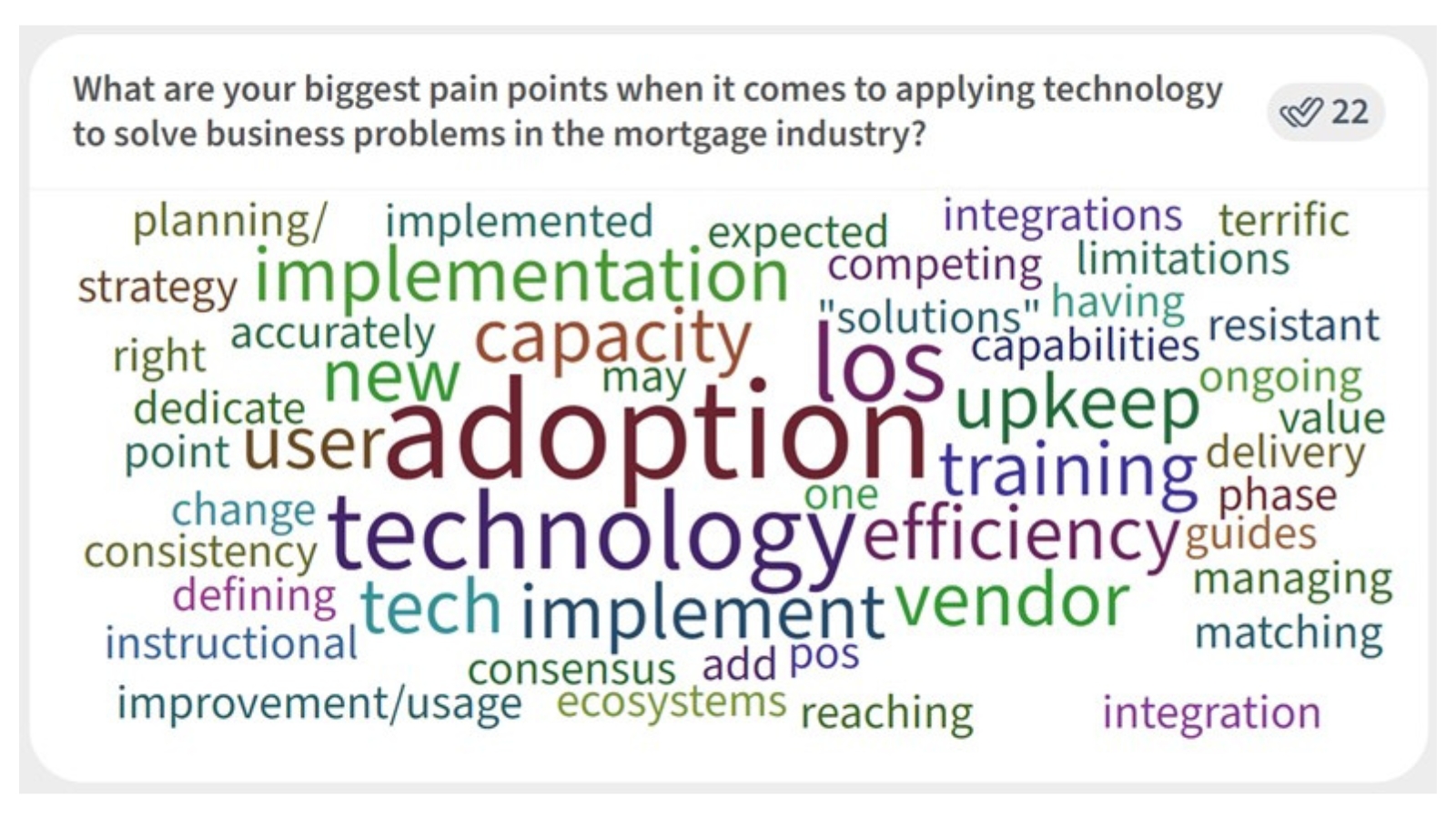 FORTIER: Well dang, Jen. We were having fun here, then you threw that curveball! Seriously though, adoption is tough, and we continually hear lenders struggling with it. It’s always a hot topic in our operations and technology workshops. As you can see in Chart 3 below, in our most recent Technology Workshop, when asked about their biggest pain point related to applying technology to solve a business problem, mortgage lenders cited adoption as their biggest challenge.